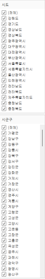 왼쪽 패널에서 '시도'와 '시군구' 오른쪽 클릭 > 필터 표시 클릭한다.
